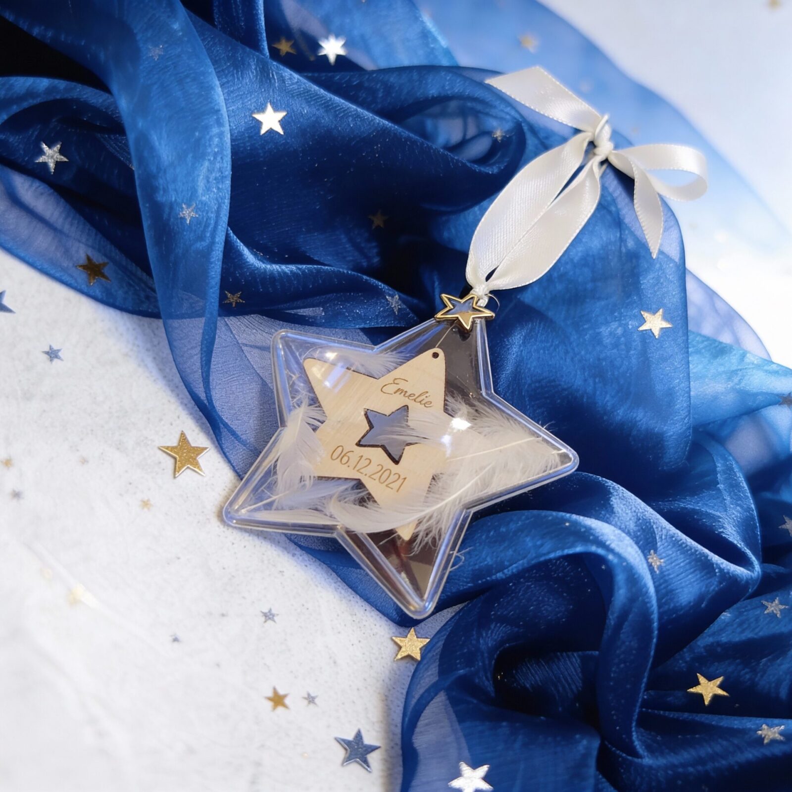 Der achtsam personalisierte Holzstern ist gebettet zwischen weichen Federn und steht sinnbildlich für die Liebe, die wir sowohl im Inneren als auch im Außen spüren.