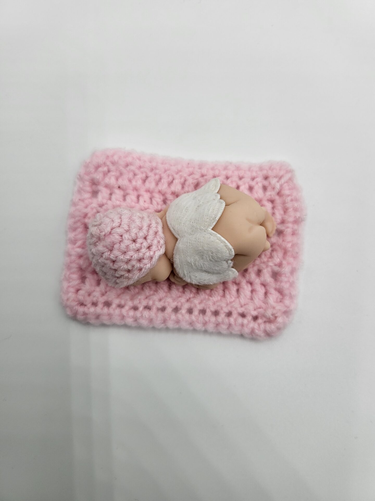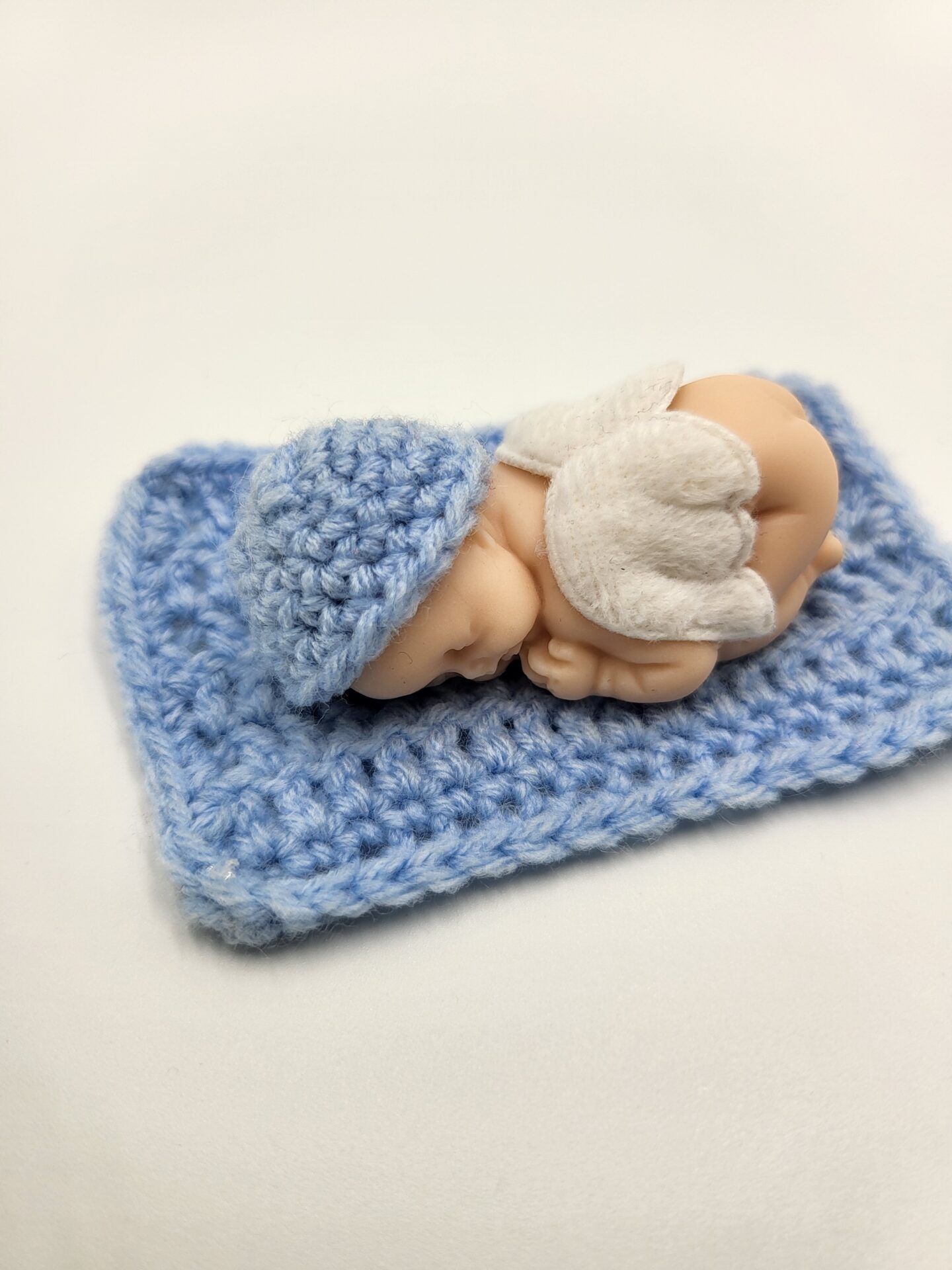 Produkt enthält: Babyfigur aus Fimo mit Engelsflügeln, Handgehäkeltes Häubchen und Decke (Farbe wählbar)