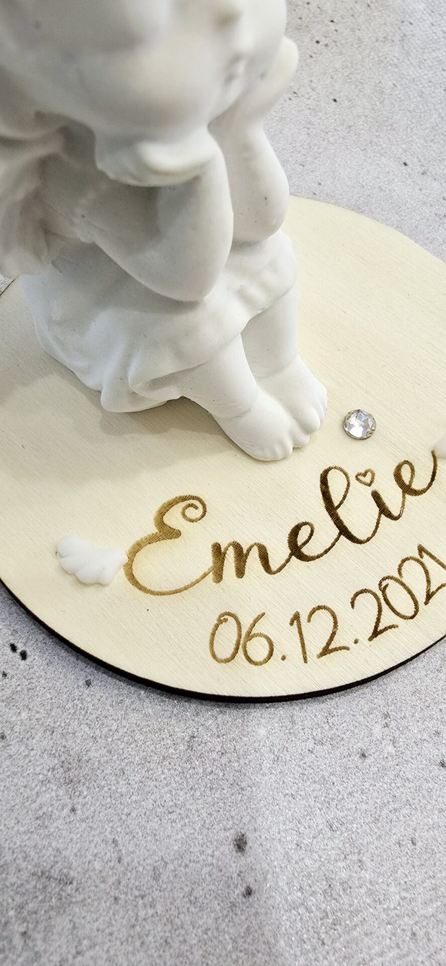 Produkt enthält: Handgegossenen Gipsengel aus hochwertigem Gips, Holzscheibe (personalisierbar),