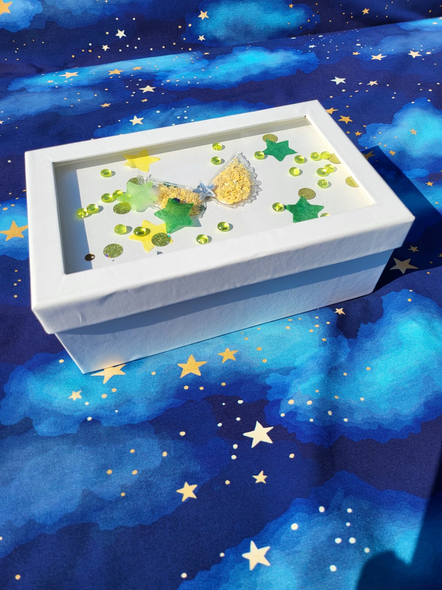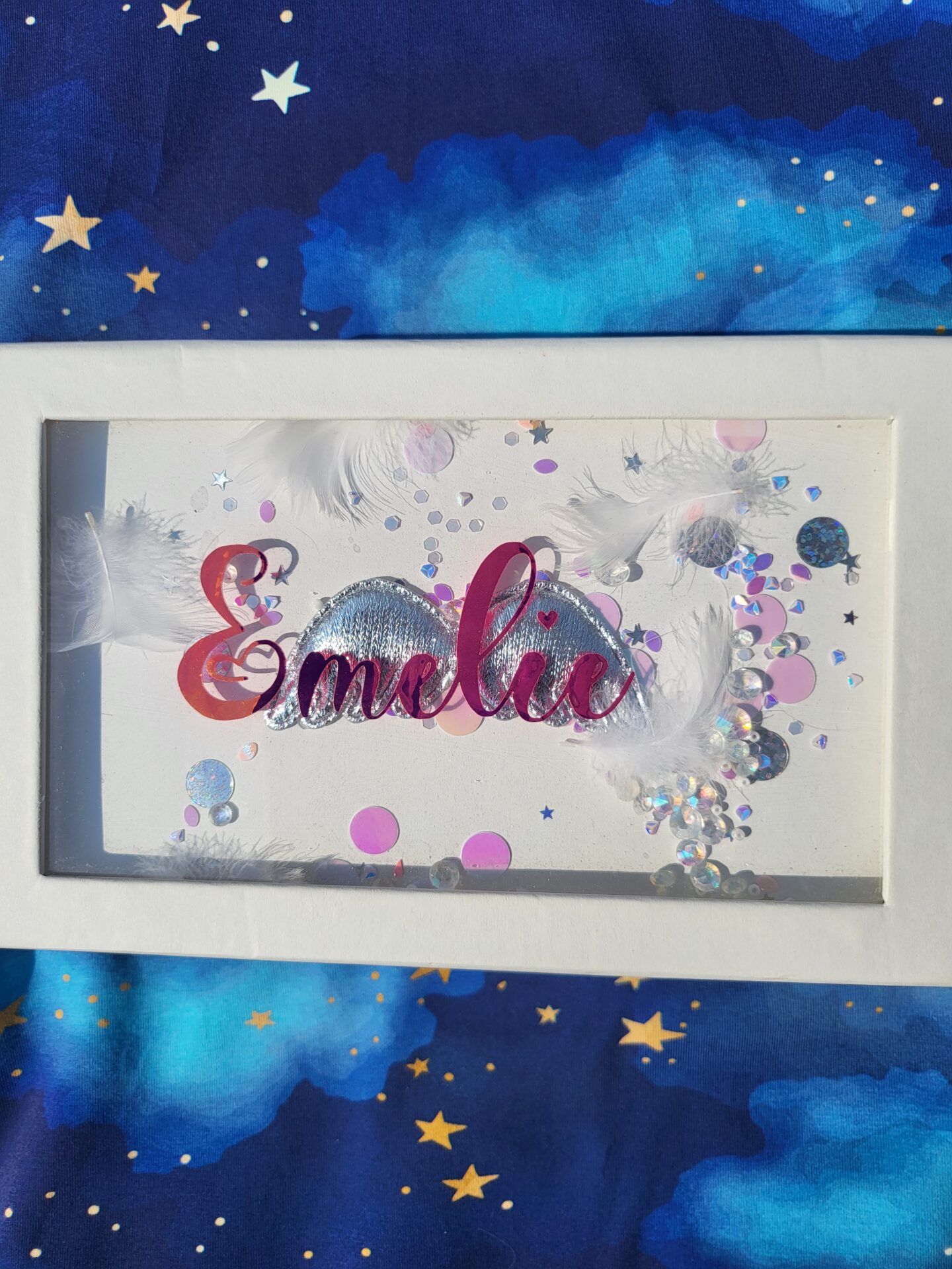 Der Deckel ist mit kleinen Streuartikeln gefüllt, die durch das Schütteln der Box den Namen deines Kindes in einen zarten Glitzerregen taucht.