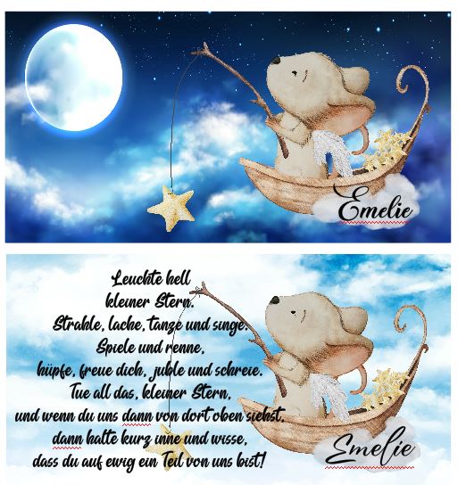 Die liebevollen Illustrationen der Babytiere werden gemeinsam mit den Daten und/oder einem Foto deines Sternenkindes aufgedruckt,