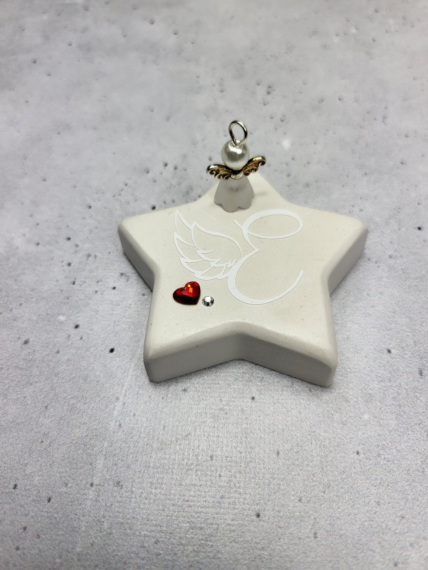 Produkt enthält: Handgegossenen Gipsstern aus hochwertigem Gips, Schriftzug (personalisierbar), Engelsanhänger, hochwertiges Steinchen