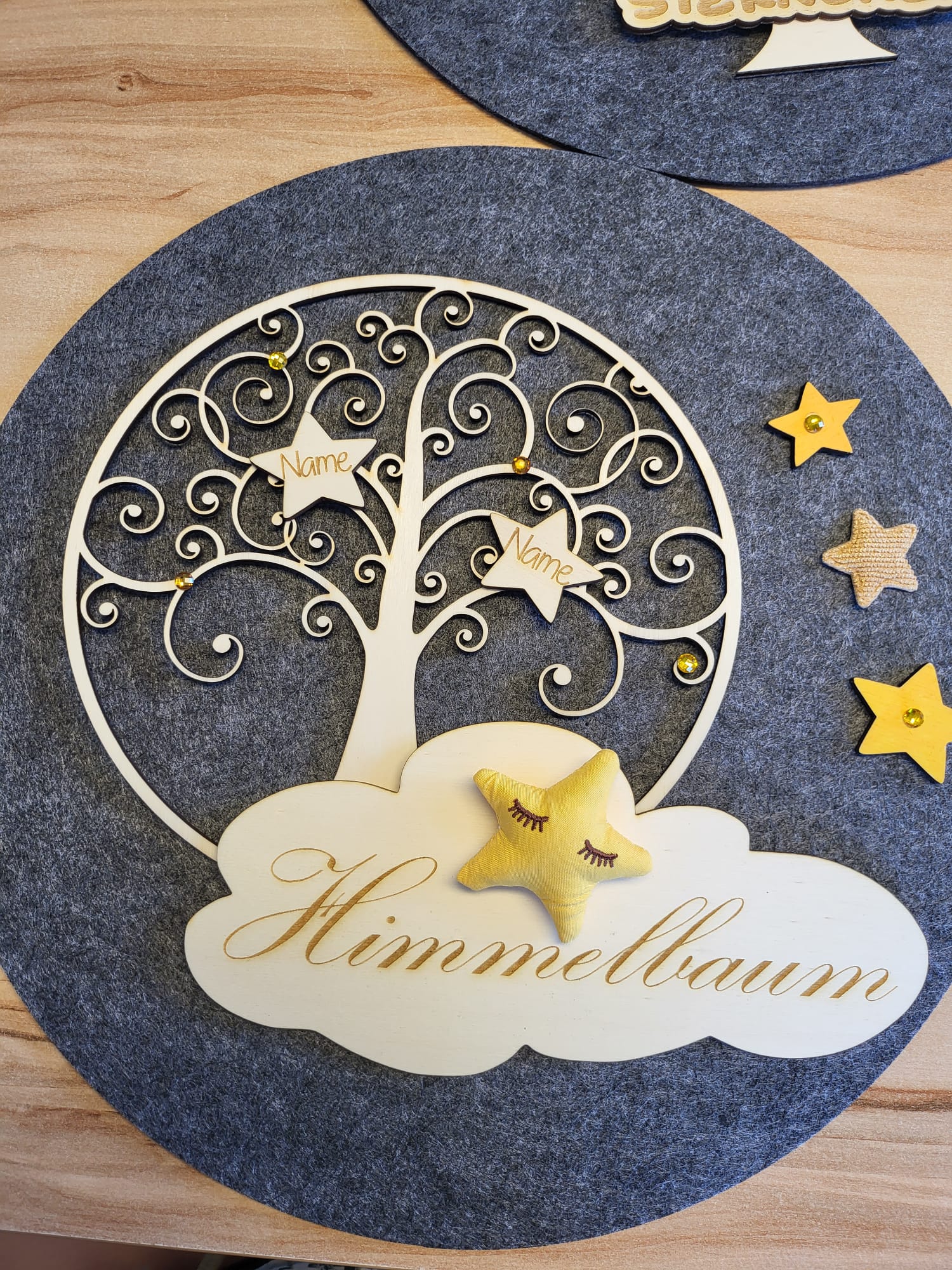 Produkt enthält: Holzbaum, Holzsterne (personalisiert), Holzwolken,